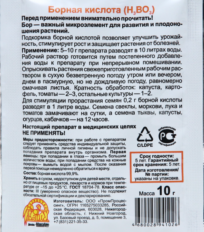 Кратность обработок: капуста, картофель, томаты — 2–3, остальные культуры — 1–2. Для стимуляции прорастания семян 0,2 г борной кислоты разводят в 1 литре воды.