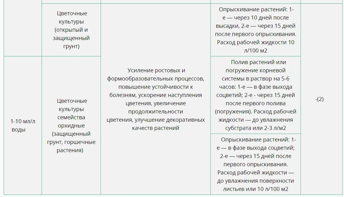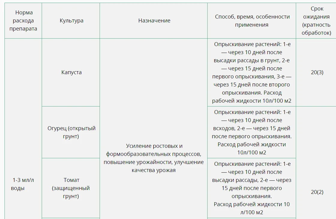 Применяется на капусте, огурцах, томатах, цветочных культуры для усиления ростовых и формообразовательных процессов, повышения урожайности, улучшения качества урожая,ускорения наступления цветения, увеличения периода цветения.