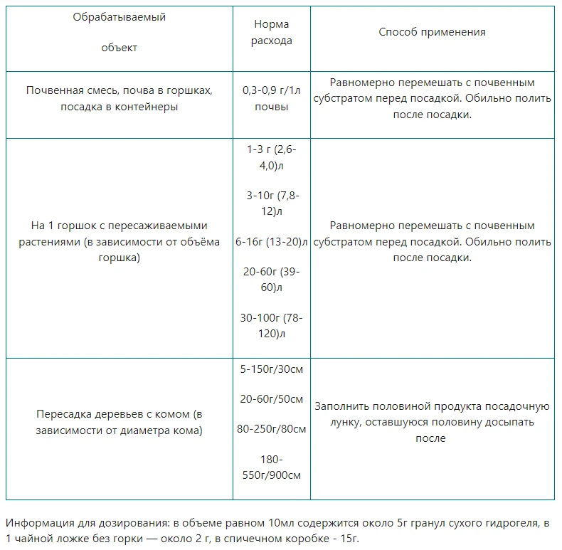 Гранулы «Зеба» быстро поглощают и удерживают влагу и растворенные питательные вещества при поливах и осадках, а в условиях засухи способны равномерно высвобождать влагу для использования растениями.