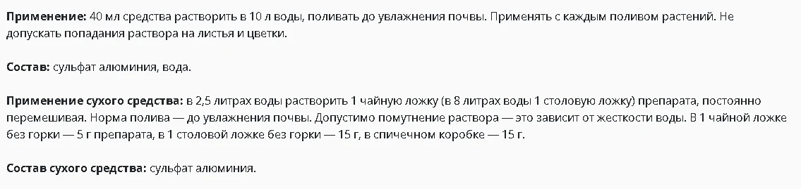 Применяется для изменения цвета крупнолистных гортензий с розового на голубой и поддержания интенсивности голубой окраски.