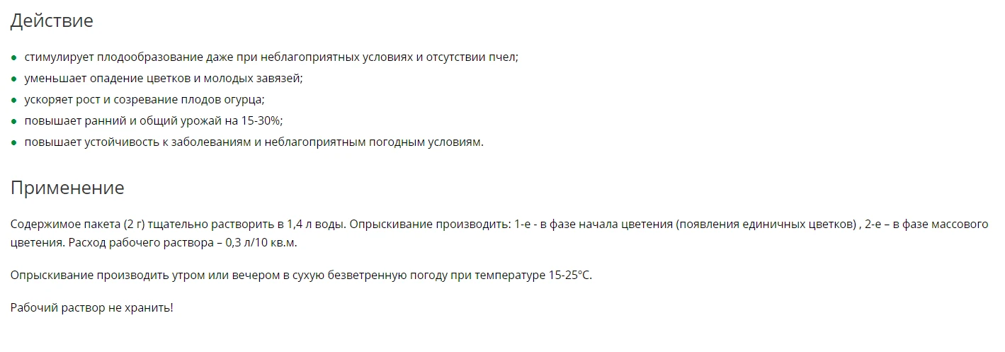 Препарат ускоряет рост и созревание плодов огурца.