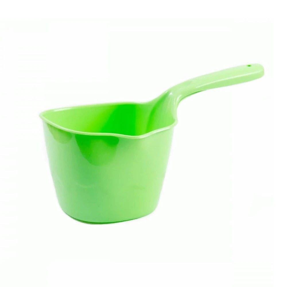 Вместительный кухонный ковш с ручкой, изготовленный из пищевого пластика, и безопасный при использовании в быту.
