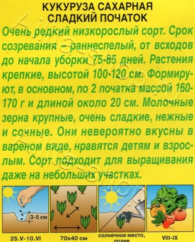 Срок созревания – раннеспелый, от всходов до начала уборки 75-85 дней.