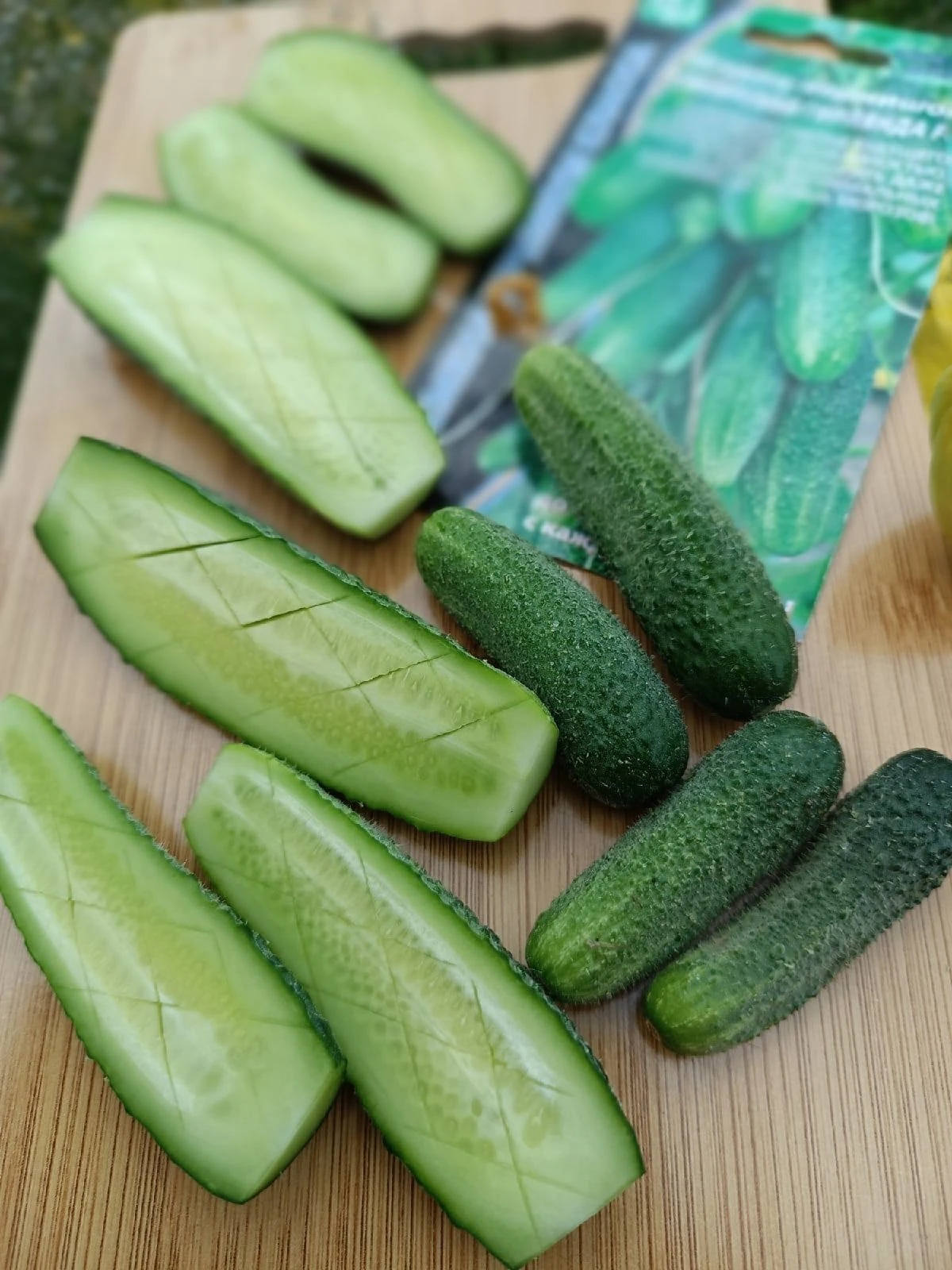 Зеленцы – короткие (корнишоны), длиной 5-8 см, насыщенного темно-зеленого цвета с короткими светлыми полосами.