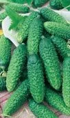 Плоды темно-зелёного цвета, крупнобугорчатые, длиной 8-10 см, плотные, хрустящие, с белым опушением, без горечи.