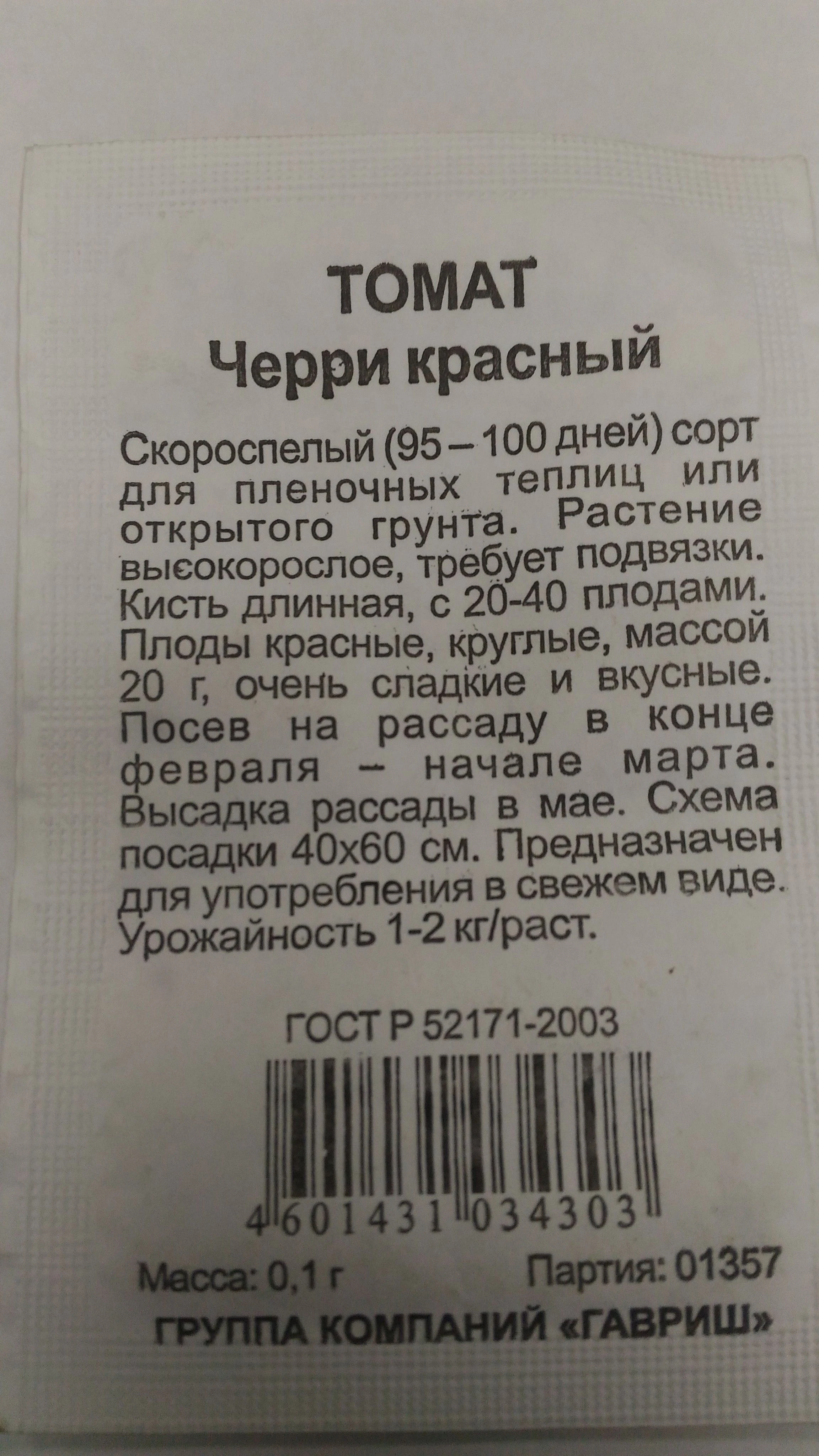 Акция -5% Количество товара в упаковке 20 ШтрихКод 4601431034303 Вид томатов Мелкоплодные Комнатная культура Нет Не в реестре Да Сорт томатов Индетерминантные Срок созревания Ранний Торговая марка Гавриш Цвет плода Красный -