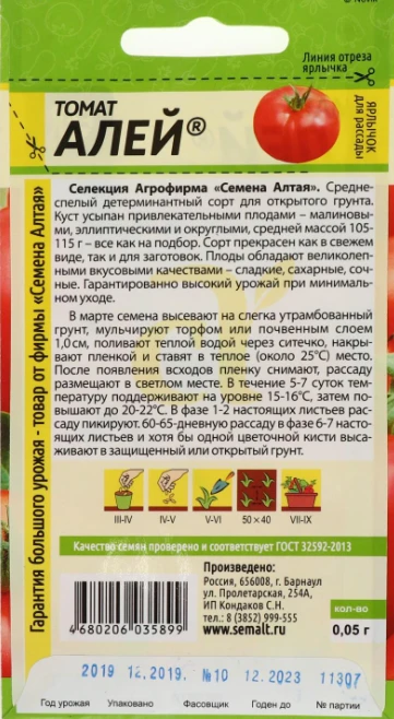 Количество товара в упаковке 10 ШтрихКод 4680206035899 Вид томатов Среднеплодные Комнатная культура Нет Не в реестре Нет Сорт томатов Детерминантные Срок созревания Средний Торговая марка Семена Алтая (Барнаул) Цвет плода Малиновый -