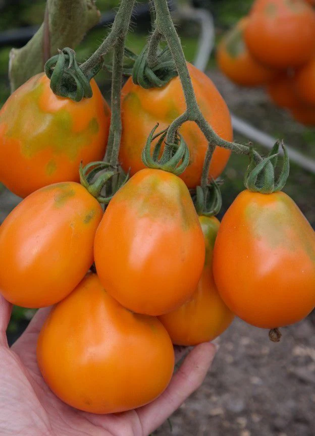 Плоды грушевидной формы, среднеребристые, оранжевой окраски, плотные, выравненные в кисти.
