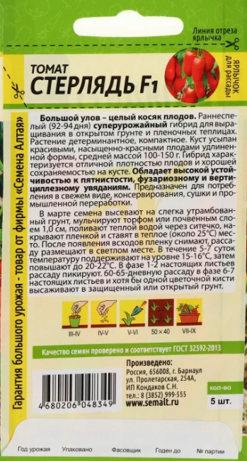 Количество товара в упаковке 5 ШтрихКод 4680206048349 Вид томатов Среднеплодные Комнатная культура Нет Не в реестре Да Сорт томатов Детерминантные Срок созревания Ранний Торговая марка Семена Алтая Цвет плода Красный -