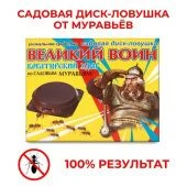 «Великий воин» садовая диск-ловушка от муравьев. Большая диск-ловушка содержит запас приманки для уничтожения даже очень крупных колоний муравьёв. Каждая диск-ловушка разработана специально для условий сада — удобна в установке, прочно закрепляется, приманка защищена от солнечных лучей и дождя. Сохраняет эффективность длительное время. Обладает длительным кишечным действием. Многоразовая, будет служить долго! Состав: диазинон — 0,2%, хлорпирифос — 0,3 %, стабилизатор, консервант, гелеобразователь, битрекс и пищевые наполнители. Применение: 1. Достать диск-ловушку (корпус), из тубы в специальное углубления в корпусе (см. рис. 1) выдавить немного геля, не выше уровня углубления. 2. Сверху закрыть (до фиксации) крышкой (рис. 2). 3. Разместить в саду, в непосредственной близости от муравейника. Важно! — ловушку установить на ровной уплотнённой почве или траве, предварительно удалить излишки травы, чтобы облегчить доступ муравьям с почвы к ловушке (рис. 3). 4. Зафиксировать ловушку с помощью шты