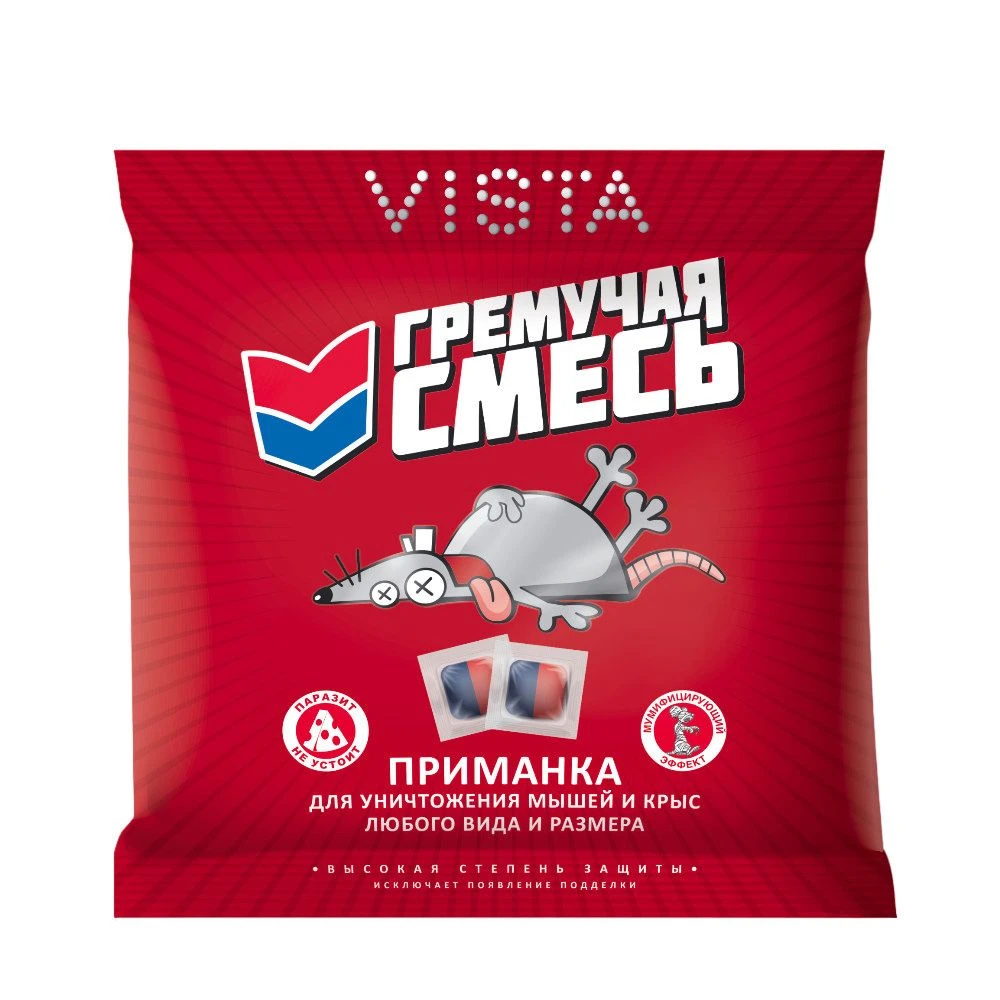 Родентицидное средство "Гремучая смесь" - это готовая к применению пищевая тестообразная приманка красного и синего цвета в равных долях.
