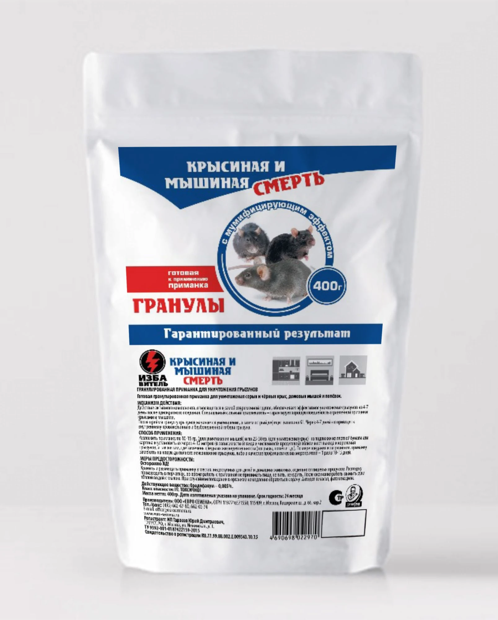 "Готовая пищевая отравленная приманка для уничтожения серых и черных крыс, домовых мышей, полевок и других мышевидных грызунов для применения населением в быту.