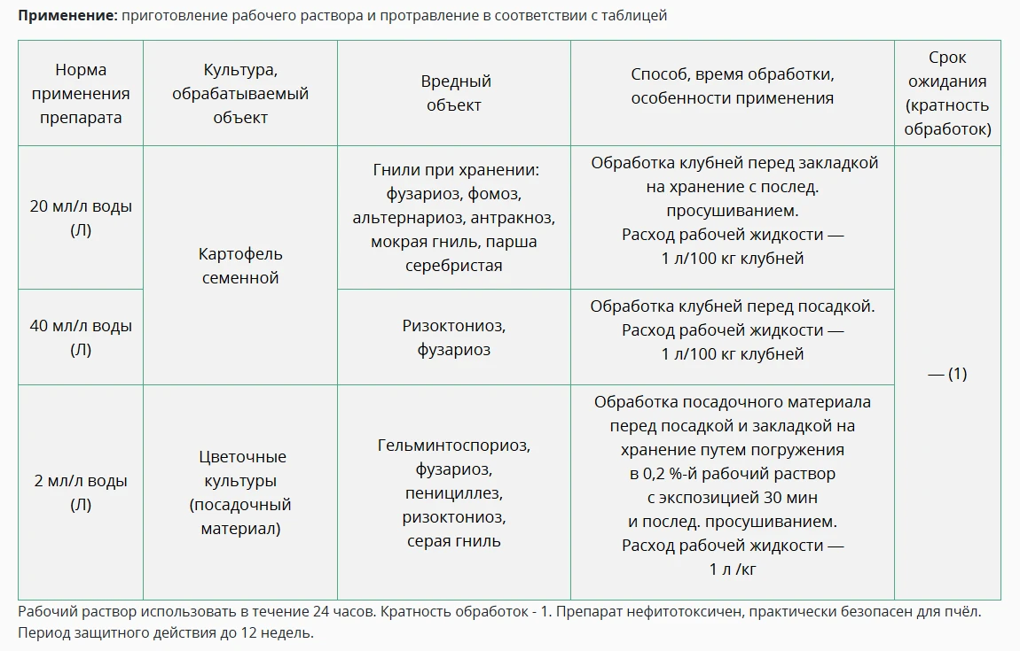 Препарат эффективен против всех видов гнилей, плесени, фузариоза, ризоктониоза, парши и других заболеваний, защищает растения от болезней в течение всего периода роста и хранения.
