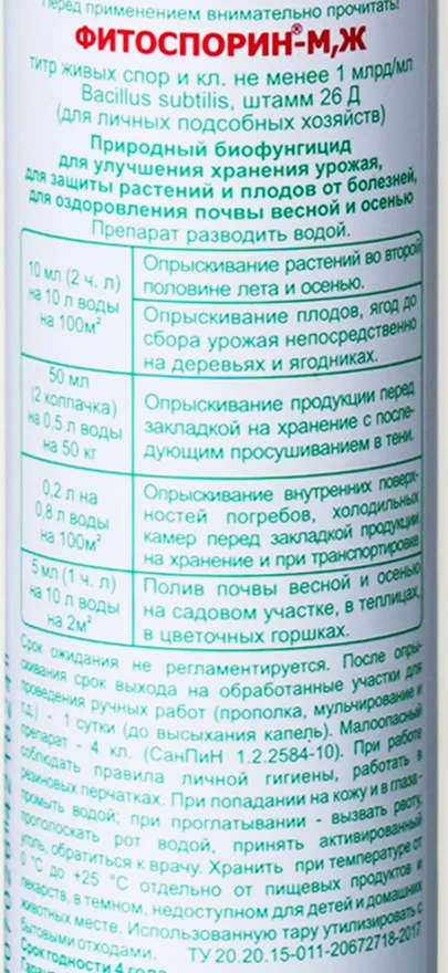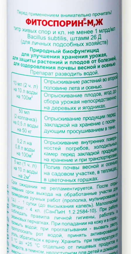 Опрыскивание растений во второй половине лета и осенью; опрыскивание плодов, ягод до сбора урожая непосредственно на деревьях и ягодниках - 10 мл. (2 ч.л.) на 10 л воды на 100 м2. -