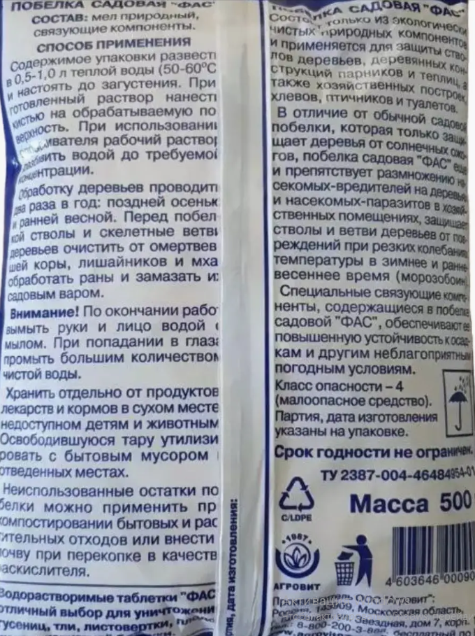 Специальные связующие компоненты, содержащиеся в побелке садовой ФАС, обеспечивают ее повышенную устойчивость к осадкам и другим неблагоприятным погодным условиям.