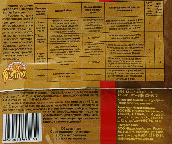 Микробиологический препарат для томатов открытого и защищенного грунта, огурцов защищенного грунта и яблонь.