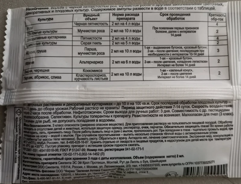Системный фунгицид для защиты плодовых и овощных культур, картофеля, винограда и сахарной свеклы от комплекса болезней.