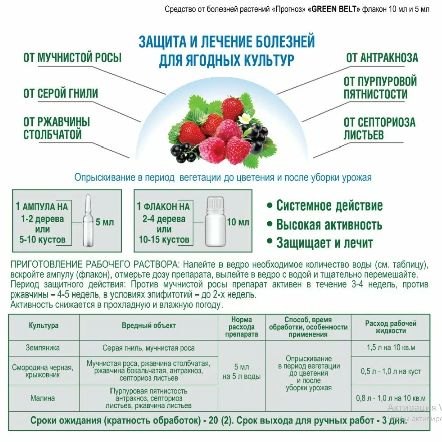Защищает землянику, смородину, малину, крыжовник от мучнистой росы, парши, пятнистости и других болезней;