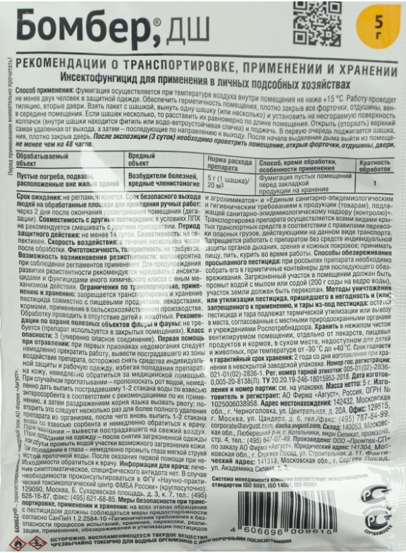 Способ применения Фумигация пустых помещений перед посевом семян, посадкой растений.