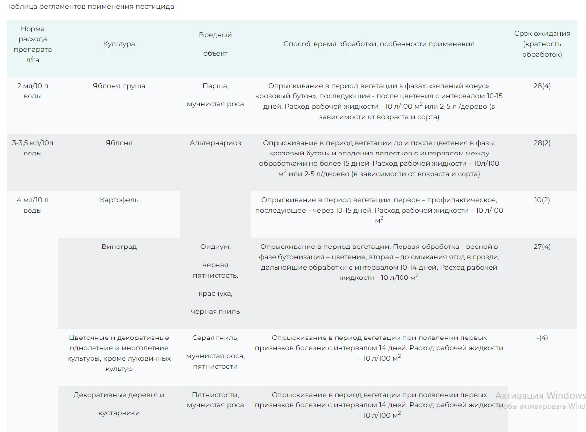 Имеет гибкие сроки применения на плодовых культурах (применяется в фазах зеленый конус, розовый бутон, рост плодов).