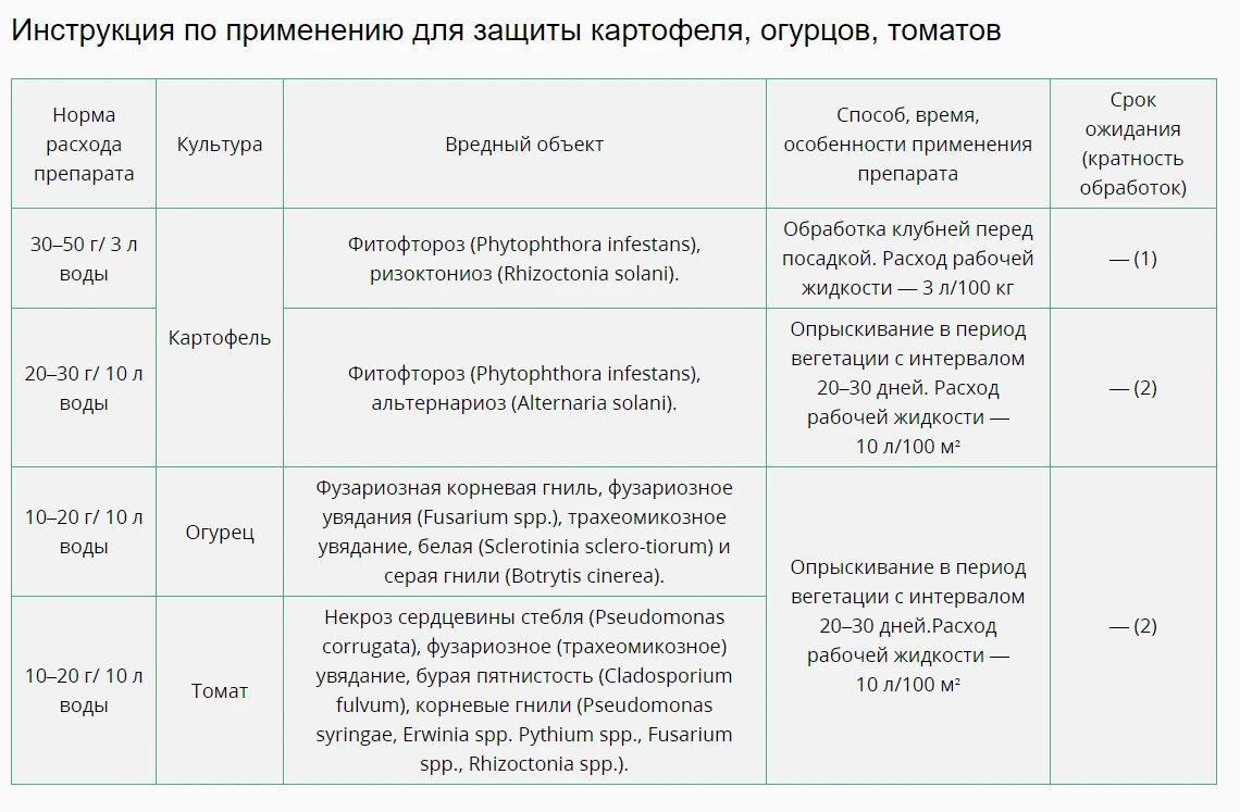 Применяется на картофеле, огурцах, томатах от фитофтороза, фузариозной корневой гнили, фузариозного увядания, белой и серой гнили, некроза сердцевины стебля, бурой пятнистости, корневых гнилей.