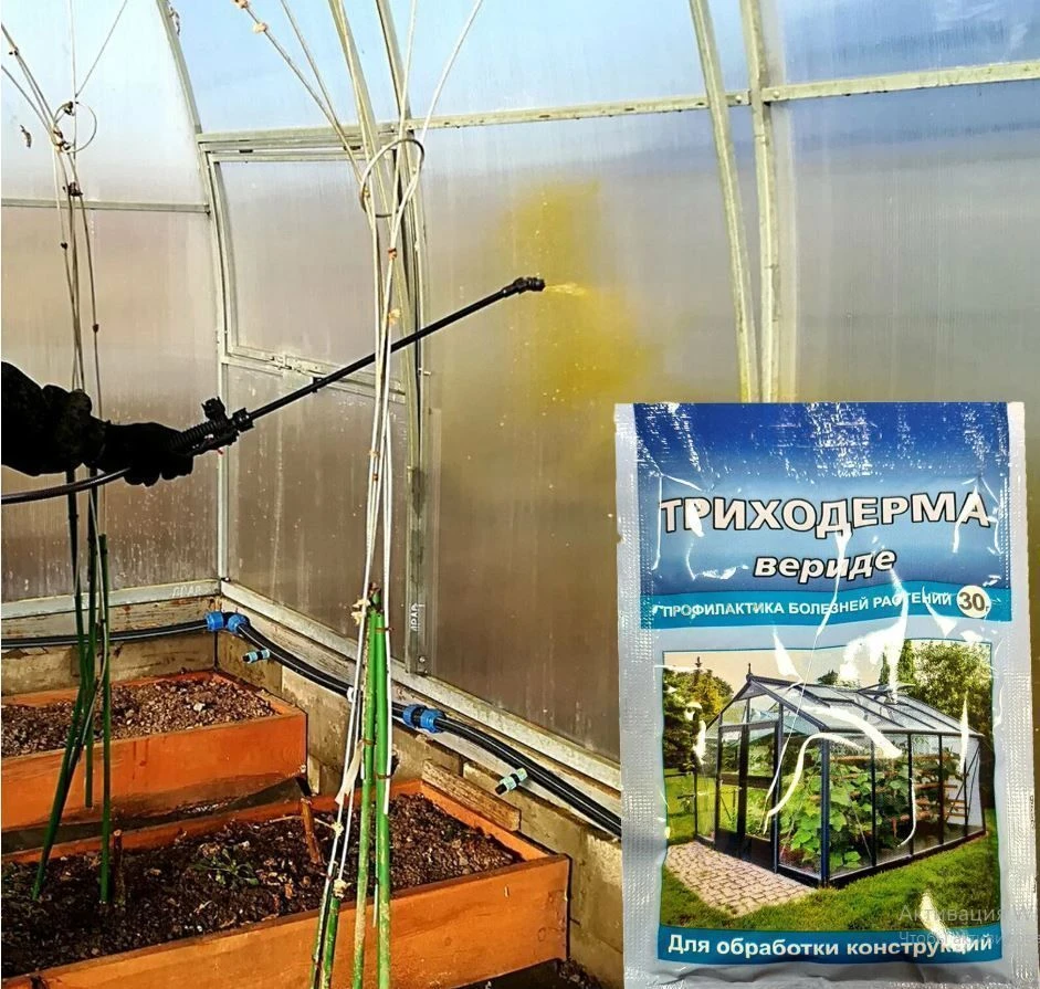 Благодаря фунгицидным свойствам Trichoderma препарат уничтожает патогены на поверхностях теплиц и препятствует их развитию, тем самым предотвращая заражение растений.