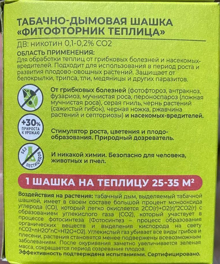 Табачная шашка «ФИТОФТОРник теплица» предназначается для обработки парников и теплиц от грибковых болезней и насекомых-вредителей.