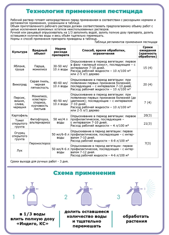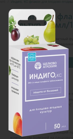 «Индиго, КС» – медьсодержащий препарат нового поколения, предназначенный для борьбы с комплексом болезней на плодово-ягодных культурах. «Индиго,КС» – концентрированный препарат в жидкой форме, который не выпадает в осадок. Он безопасен для культур, совместим с другими препаратами. Действие «Индиго, КС» начинается сразу после обработки и продолжается в течение 14 дней в зависимости от погодных условий и инфекционной нагрузки. Максимальный фунгицидный эффект проявляется при профилактическом применении до появления симптомов болезни. Активен при температуре от 0 °C до +35 °C, не смывается дождём.