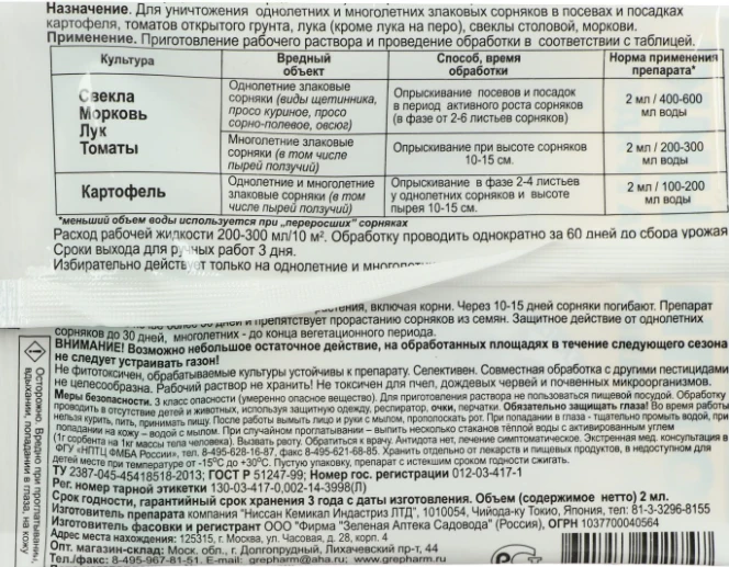 Для уничтожения однолетних и многолетних злаковых сорняков в посевах томатов открытого грунта, лука (кроме лука на перо), свеклы, моркови и картофеля.