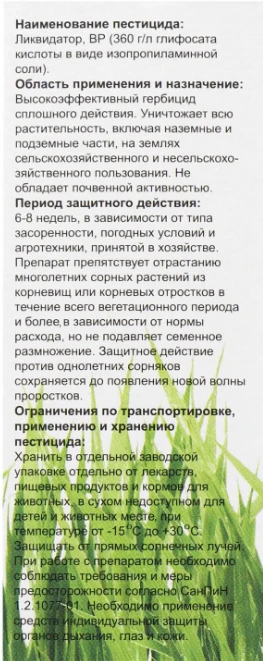 Уничтожает всю растительность, включая наземные и подземные части, на землях сельскохозяйственного и несельскохозяйственного пользования.