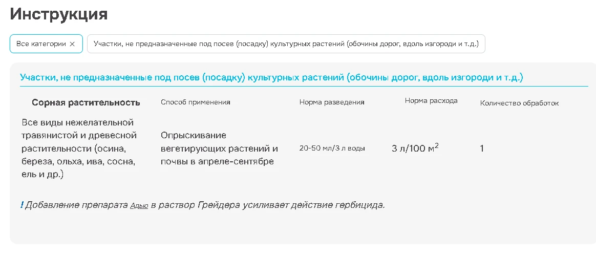 Грейдер - системный гербицид сплошного действия для уничтожения всех видов нежелательной травянистой и древесной растительности. Применяется на землях несельскохозяйственного назначения.