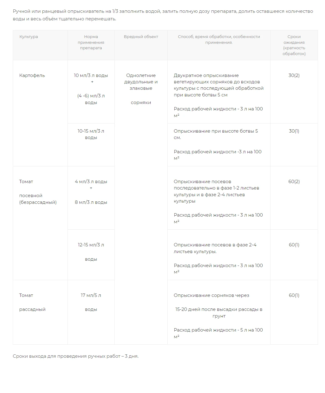 Оптимального результата можно добиться при обработке сорняков, находящихся на ранних стадиях развития и при благоприятных условиях роста (оптимальной влажности и температуре) до всходов картофеля или при высоте всходов 5 см.