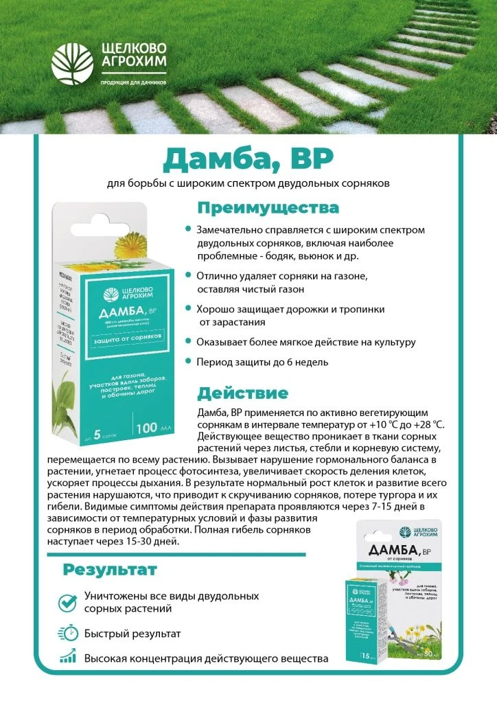 «Дамба, ВР» – средство для борьбы с широким спектром двудольных сорняков на газонах и участках, не предназначенных под посев культурных растений.