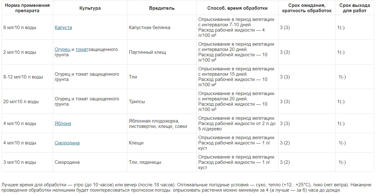Вредители погибают в течение 2-3 суток после попадания препарата внутрь насекомого, и далее защитное действие сохраняется на весь сезон.