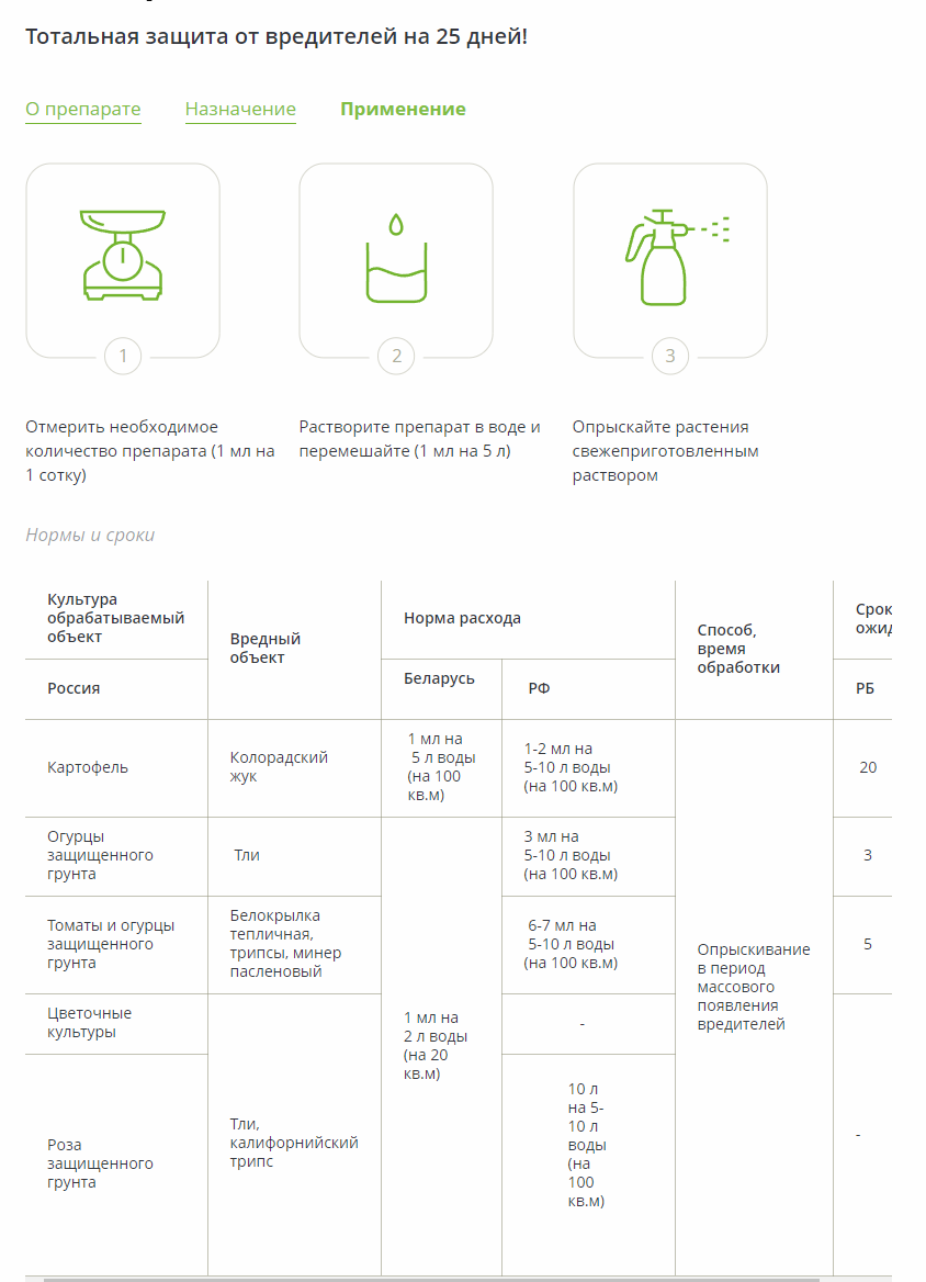 Проникает в верхние клеточные слои листьев и обеспечивает длительную защиту от вредителей.