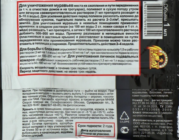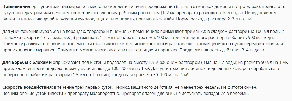 Применение: для уничтожения муравьев места их скопления и пути передвижения (в т. ч. в отмостках домов и на тротуарах),