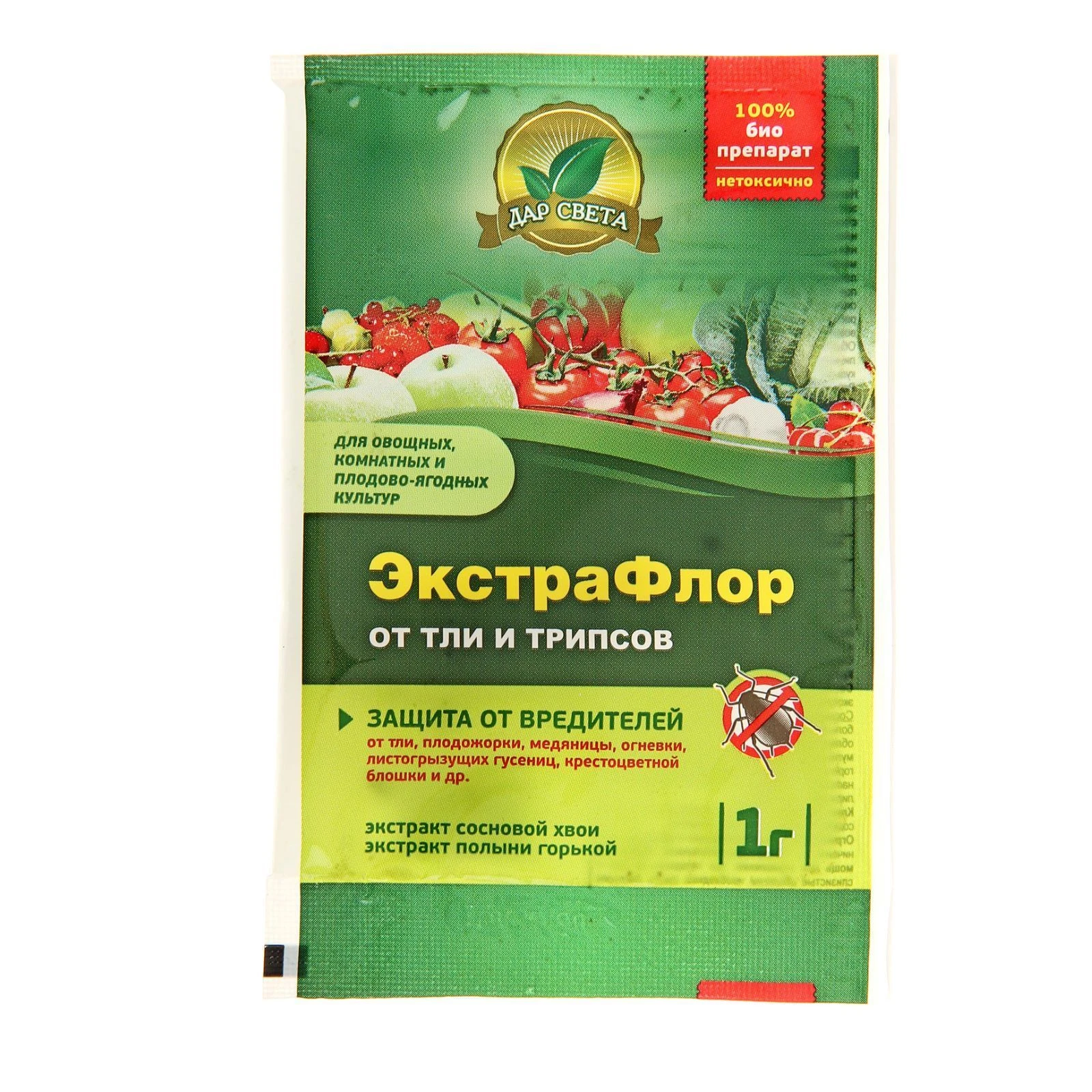 ЭкстраФлор от тли и трипсов – натуральный препарат на основе растительных экстрактов (сосновой хвои, полыни горькой) для стимулирования роста растений и борьбы с болезнями и насекомыми-вредителями: