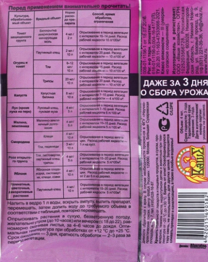 Срок ожидания от последней обработки до сбора урожая — не более 3-х суток.