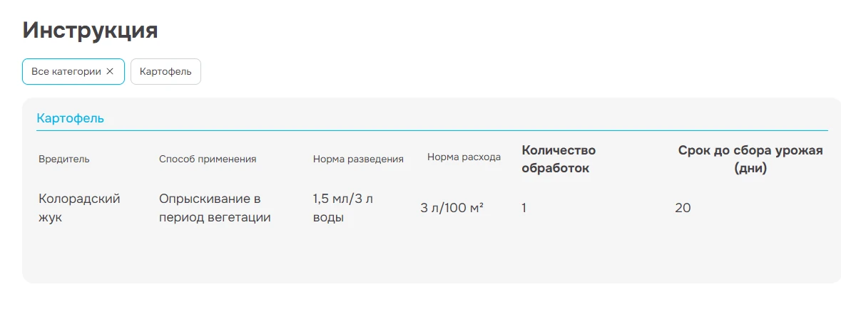 Одна обработка обеспечивает защиту картофеля на весь сезон.
