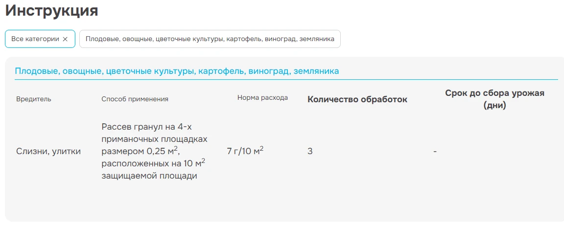 Современный препарат от слизней и улиток на овощных, плодовых, ягодных, цитрусовых, цветочно-декоративных культурах и винограде.
