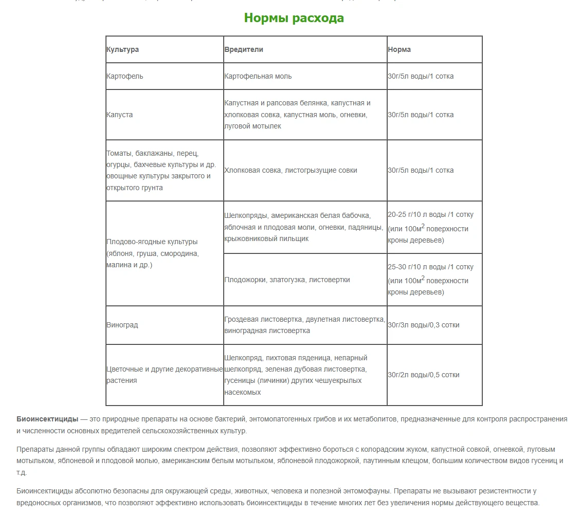 Микробиологический инсектицид для борьбы с чешуекрылыми насекомыми-вредителями овощных, плодово-ягодных и декоративных культур.