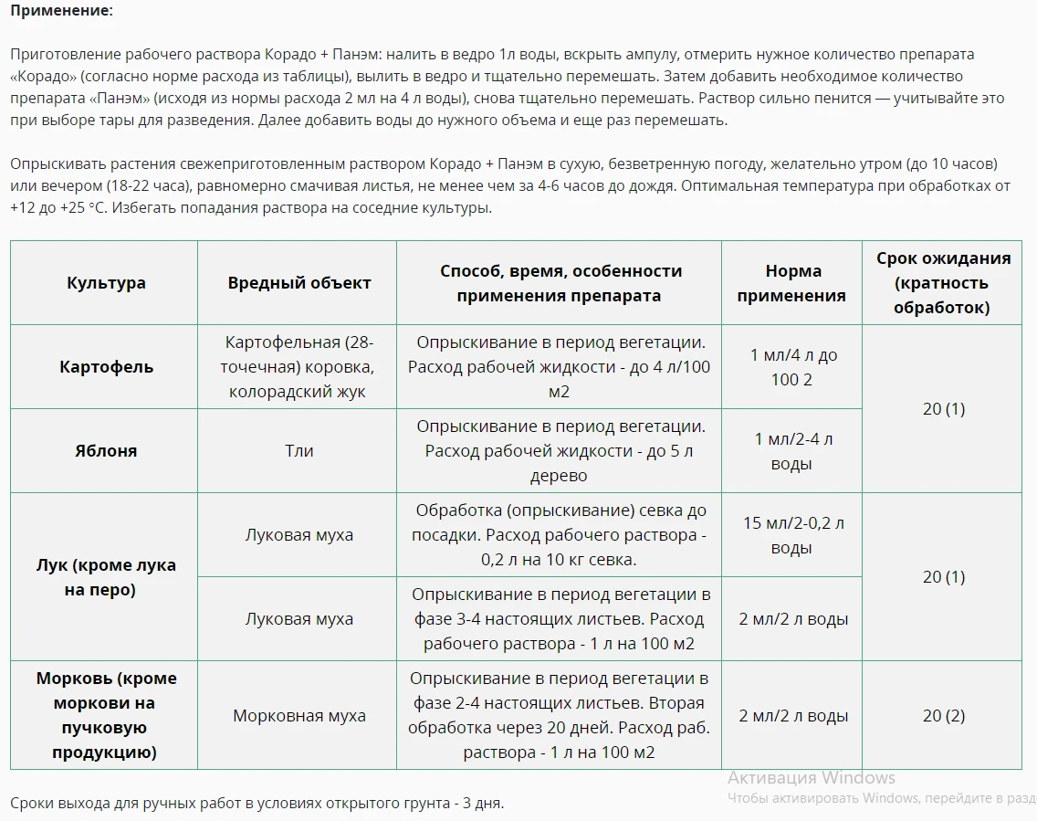 Приготовление рабочего раствора Корадо + Панэм: налить в ведро 1л воды, вскрыть ампулу, отмерить нужное количество препарата «Корадо» (согласно норме расхода из таблицы), вылить в ведро и тщательно перемешать.