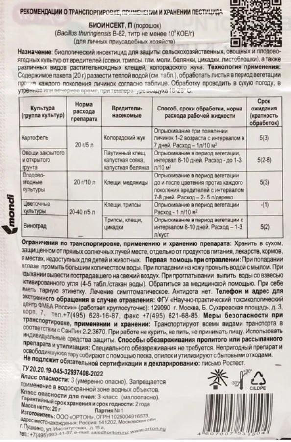 Содержимое пакета (20 г) развести теплой водой (см. табл.), обработать листья в период вегетации против каждого поколения личинок согласно таблице. Обработку проводить в сухую погоду, в утреннее или вечернее время, при температуре воздуха 18-28ºС. -