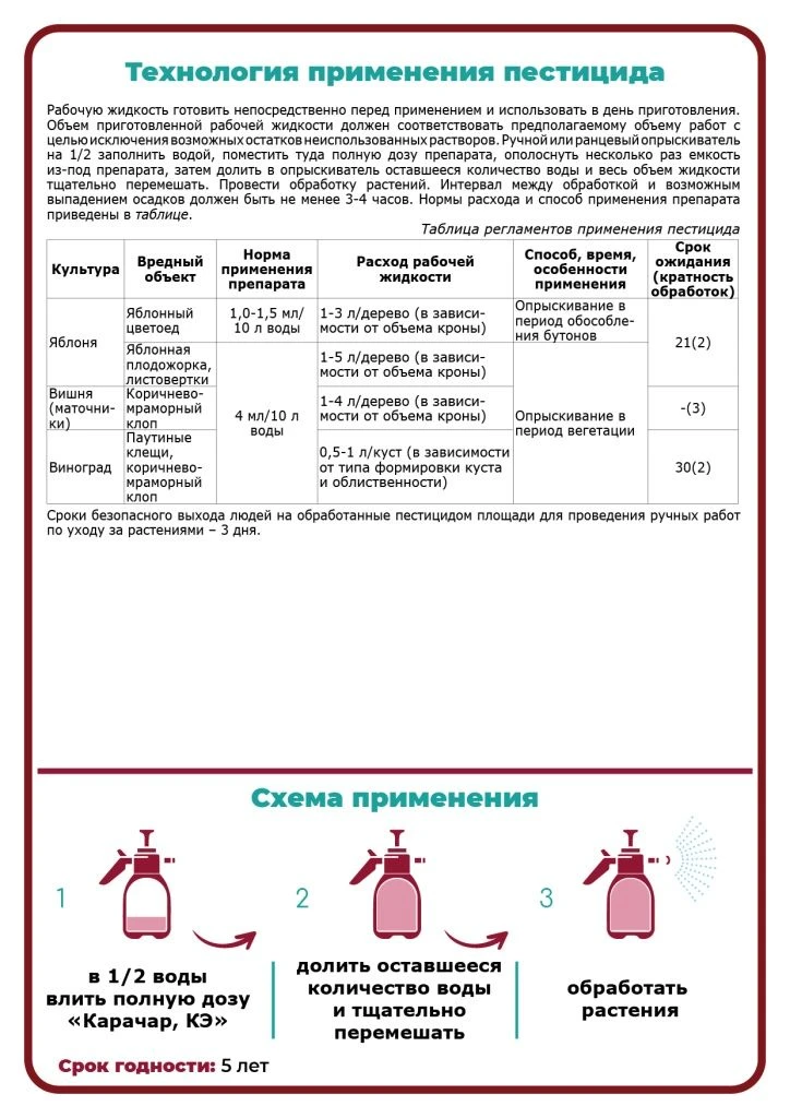 Период защитного действия от этих вредителей длится не менее 14 суток. «Карачар, КЭ» совместим с большинством фунгицидов и гербицидов.