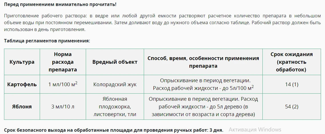Применяется на Картофеле от Колорадского жука 1 мл/100 м2.