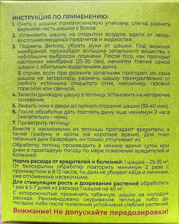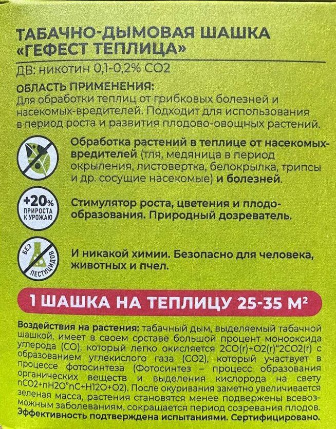 Шашка табачная дымовая ГЕФЕСТ применяется для окуривания парников и теплиц в целях борьбы с насекомыми-вредителями: тлей, медяницей (в период окрыления), листоверткой, белокрылкой, паутинным клещиком и другими.