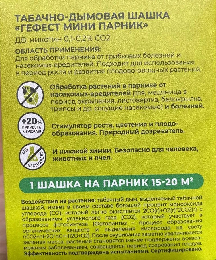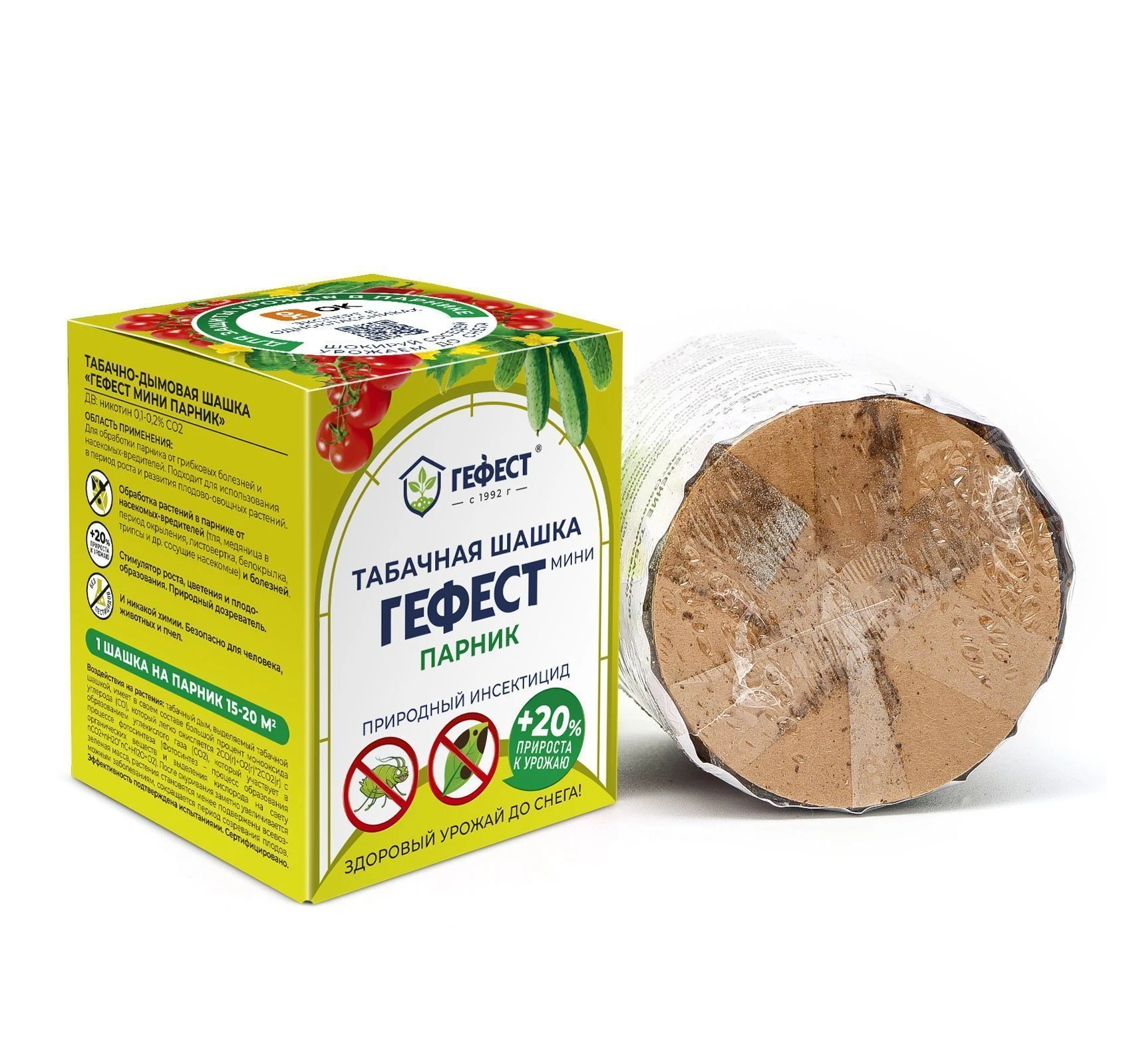 Шашка табачная дымовая ГЕФЕСТ применяется для окуривания парников и теплиц в целях борьбы с насекомыми-вредителями: тлей, медяницей (в период окрыления), листоверткой, белокрылкой, паутинным клещиком и другими.