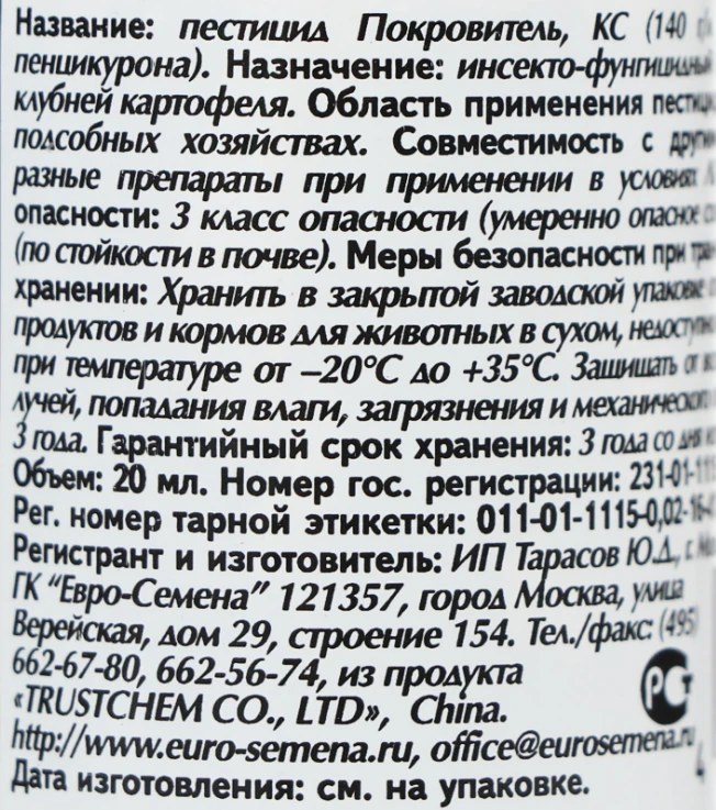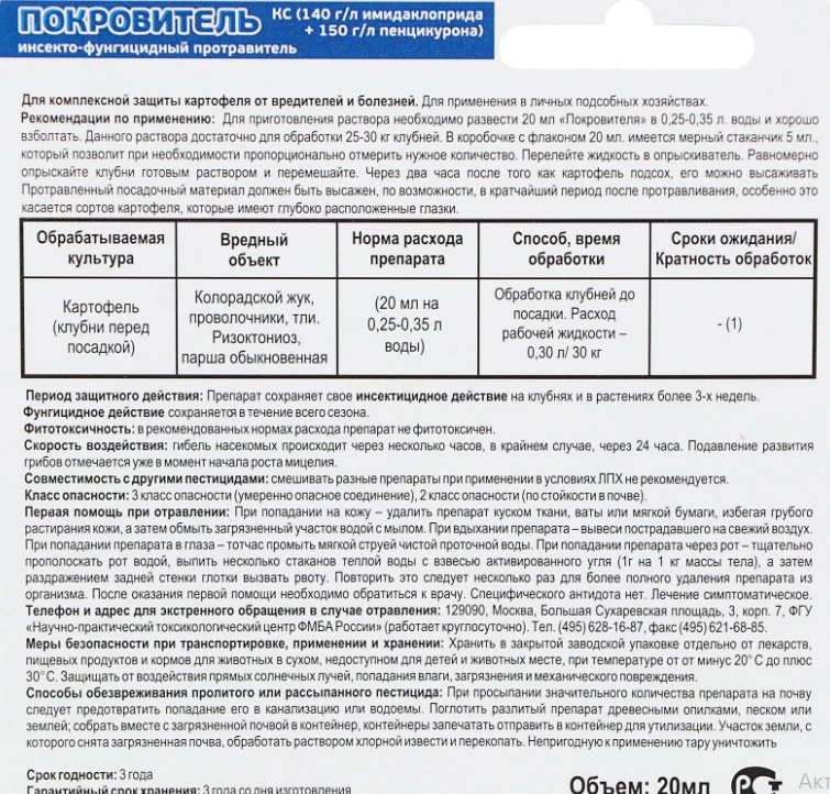 Покровитель – инсекто-фунгицидный препарат для обработки картофеля и других овощных, плодовых и цветочных культур от грызущих, сосущих вредителей, а также от болезней.