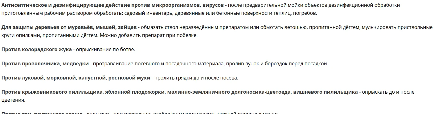 Антисептическое и дезинфицирующее действие против микроорганизмов, вирусов - после предварительной мойки объектов дезинфекционной обработки приготовленным рабочим раствором обработать: садовый инвентарь, деревянные или бетонные поверхности теплиц, погребов.