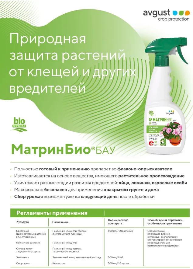 Avgust МатринБио – уникальный инсектицид для защиты от клещей и других насекомых-вредителей.